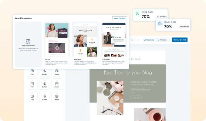 Get started fast with professionally designed, pre-set email templates. These templates cover common use cases such as promotions, announcements, follow-ups, and newsletters. Each layout follows proven design best practices to improve open rates and clicks. You can use them as-is or make quick edits to match your brand. This means less time designing and more time sending emails that work.