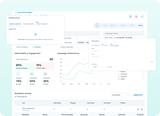 Voicemail campaigns help you scale outreach with ease. Send targeted voicemail messages to specific contact lists for promotions, announcements, or updates. Campaign tools help you stay organized and consistent while reaching a larger audience. This makes voicemail a reliable option for ongoing communication.
